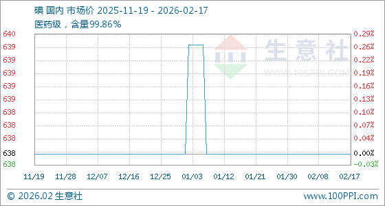 2月17日,生意社碘基准价为638.33元/千克,与本月初持平。