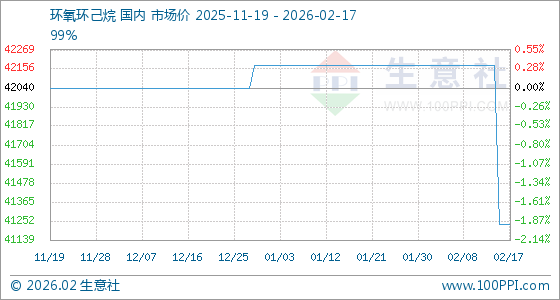 2月17日,生意社环氧环己烷基准价为41233.33元/吨,与本月初(42175.00元/吨)相比,下降了2.23%。