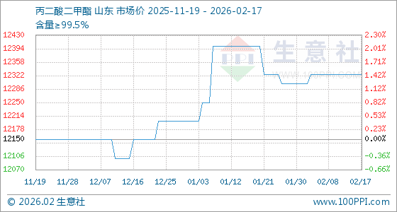 2月17日,生意社丙二酸二甲酯基准价为12325.00元/吨,与本月初(12300.00元/吨)相比,上涨了0.20%。