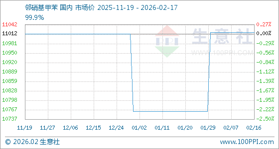 2月17日,生意社邻硝基甲苯基准价为11016.67元/吨,与本月初持平。