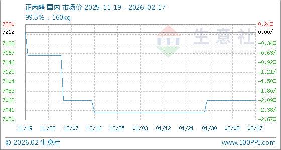 2月17日,生意社正丙醛基准价为7062.50元/吨,与本月初持平。