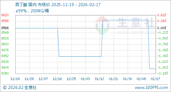 2月17日,生意社异丁酸基准价为8400.00元/吨,与本月初(8600.00元/吨)相比,下降了2.33%。