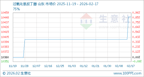 2月17日,生意社过氧化氢叔丁醇基准价为10450.00元/吨,与本月初(10400.00元/吨)相比,上涨了0.48%。