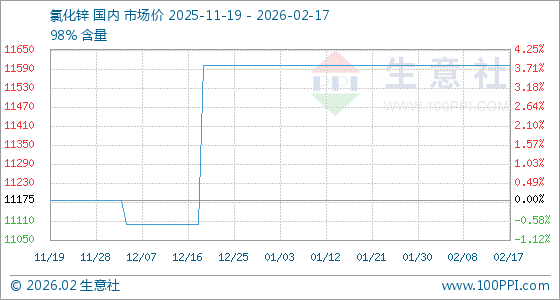 2月17日,生意社氯化锌基准价为11600.00元/吨,与本月初持平。