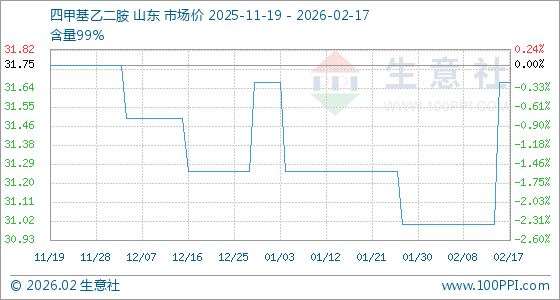 2月17日,生意社四甲基乙二胺基准价为31.67元/千克,与本月初(31.00元/千克)相比,上涨了2.16%。