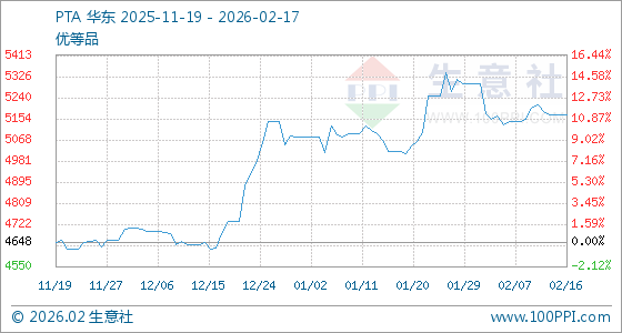 2月17日,生意社PTA基准价为5168.50元/吨,与本月初(5298.83元/吨)相比,下降了2.46%。