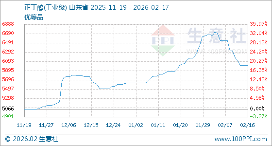 2月17日,生意社正丁醇(工业级)基准价为6000.00元/吨,与本月初(6663.33元/吨)相比,下降了9.95%。
