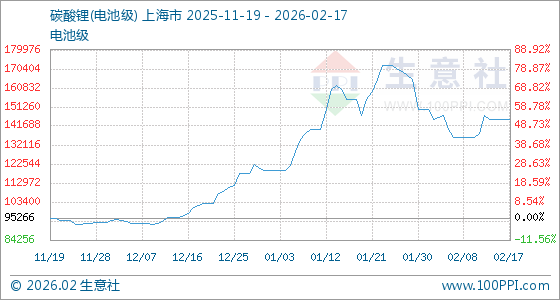 2月17日,生意社碳酸锂(电池级)基准价为145000.00元/吨,与本月初(150000.00元/吨)相比,下降了3.33%。