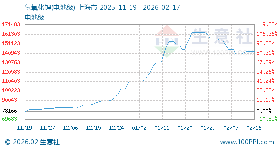 2月17日,生意社氢氧化锂(电池级)基准价为143000.00元/吨,与本月初(156000.00元/吨)相比,下降了8.33%。