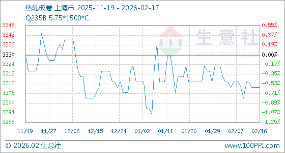 2月17日,生意社热轧板卷基准价为3310.00元/吨,与本月初(3323.33元/吨)相比,下降了0.4%。