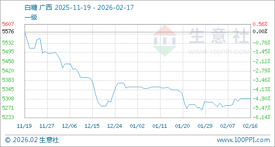 2月17日,生意社白糖基准价为5310.00元/吨,与本月初(5295.00元/吨)相比,上涨了0.28%。