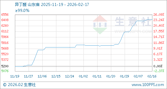 2月17日,生意社异丁醛基准价为6433.33元/吨,与本月初(6106.67元/吨)相比,上涨了5.35%。