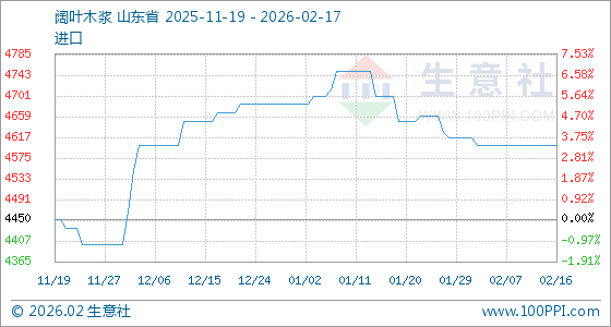 2月17日,生意社阔叶木浆基准价为4600.00元/吨,与本月初(4616.67元/吨)相比,下降了0.36%。