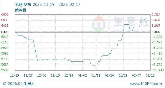 2月17日,生意社苯酚基准价为6500.00元/吨,与本月初(6450.00元/吨)相比,上涨了0.78%。