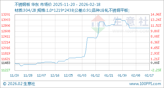 2月18日,生意社不锈钢板基准价为12725.00元/吨,与本月初(12991.67元/吨)相比,下降了2.05%。