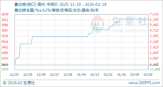 2月18日,生意社氯化钾(进口)基准价为3616.67元/吨,与本月初持平。