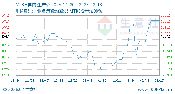 2月18日,生意社MTBE基准价为5043.33元/吨,与本月初(5023.33元/吨)相比,上涨了0.40%。