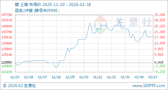 2月18日,生意社镍基准价为140100.00元/吨,与本月初(146016.67元/吨)相比,下降了4.05%。