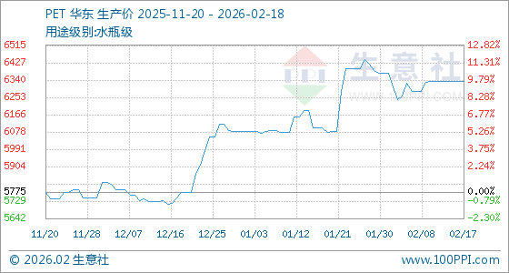 2月18日,生意社PET基准价为6335.00元/吨,与本月初(6375.00元/吨)相比,下降了0.63%。