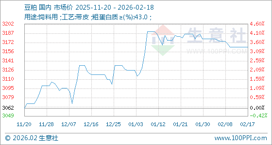 2月18日,生意社豆粕基准价为3164.00元/吨,与本月初(3178.00元/吨)相比,下降了0.44%。