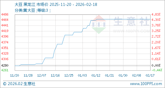 2月18日,生意社大豆基准价为4468.00元/吨,与本月初持平。
