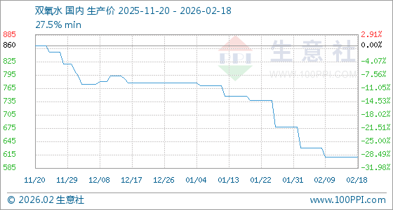 2月18日,生意社双氧水基准价为610.00元/吨,与本月初(676.67元/吨)相比,下降了9.85%。