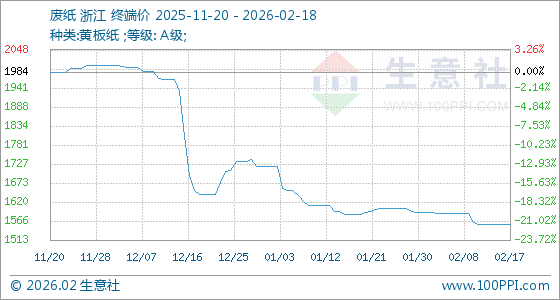 2月18日,生意社废纸基准价为1558.00元/吨,与本月初(1592.00元/吨)相比,下降了2.14%。