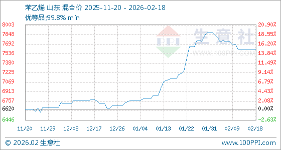2月18日,生意社苯乙烯基准价为7594.00元/吨,与本月初(7874.00元/吨)相比,下降了3.56%。