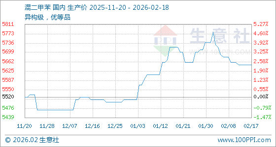 2月18日,生意社混二甲苯基准价为5650.00元/吨,与本月初(5740.00元/吨)相比,下降了1.57%。