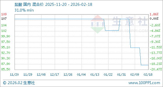 2月18日,生意社盐酸基准价为87.50元/吨,与本月初(107.50元/吨)相比,下降了18.6%。