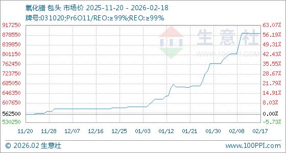2月18日,生意社氧化镨基准价为885000.00元/吨,与本月初(765000.00元/吨)相比,上涨了15.69%。