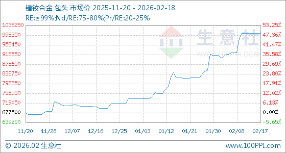 2月18日,生意社镨钕合金基准价为1005000.00元/吨,与本月初(915000.00元/吨)相比,上涨了9.84%。