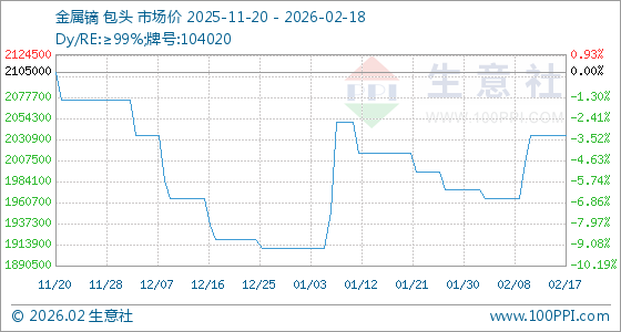 2月18日,生意社金属镝基准价为2035000.00元/吨,与本月初(1975000.00元/吨)相比,上涨了3.04%。