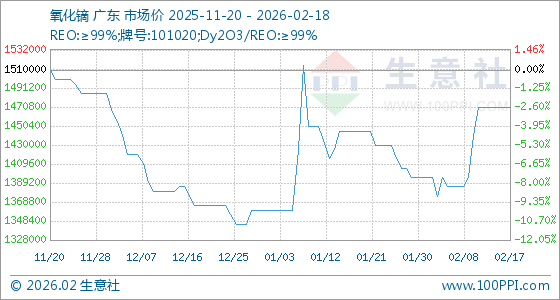 2月18日,生意社氧化镝基准价为1470000.00元/吨,与本月初(1395000.00元/吨)相比,上涨了5.38%。