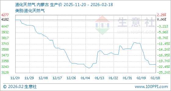 2月18日,生意社液化天然气基准价为3292.00元/吨,与本月初(3610.00元/吨)相比,下降了8.81%。