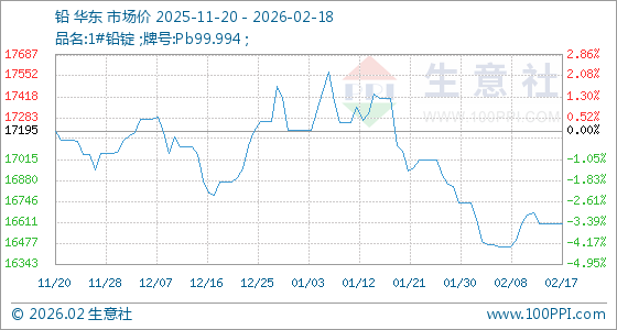 2月18日,生意社铅基准价为16600.00元/吨,与本月初(16735.00元/吨)相比,下降了0.81%。