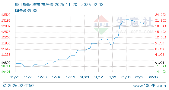 2月18日,生意社顺丁橡胶基准价为13070.00元/吨,与本月初(13250.00元/吨)相比,下降了1.36%。