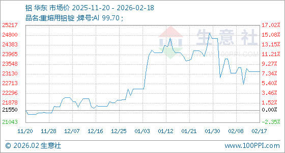 2月18日,生意社铝基准价为23223.33元/吨,与本月初(24666.67元/吨)相比,下降了5.85%。