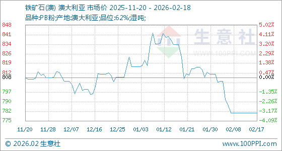 2月18日,生意社铁矿石(澳)基准价为781.44元/吨,与本月初(811.00元/吨)相比,下降了3.64%。