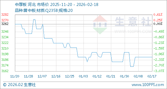 2月18日,生意社中厚板基准价为3192.00元/吨,与本月初(3202.00元/吨)相比,下降了0.31%。