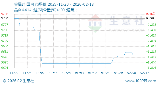 2月18日,生意社金属硅基准价为9650.00元/吨,与本月初持平。
