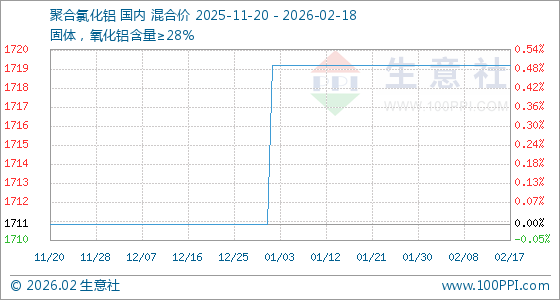 2月18日,生意社聚合氯化铝基准价为1720.00元/吨,与本月初持平。