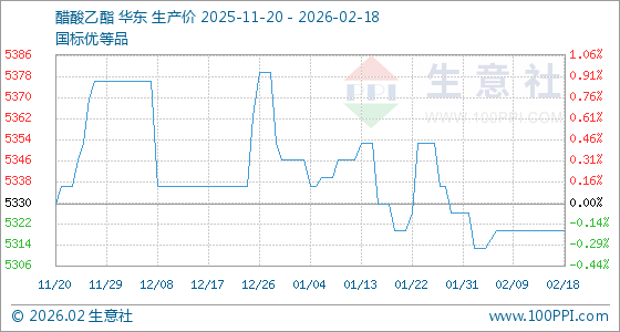 2月18日,生意社醋酸乙酯基准价为5320.00元/吨,与本月初(5326.67元/吨)相比,下降了0.13%。