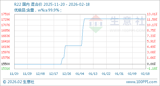 2月18日,生意社R22基准价为17333.33元/吨,与本月初持平。