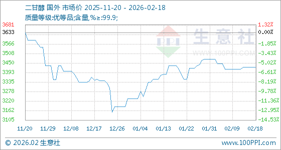 2月18日,生意社二甘醇基准价为3426.67元/吨,与本月初(3475.00元/吨)相比,下降了1.39%。
