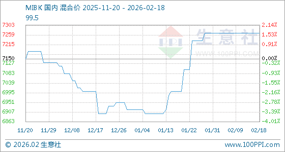 2月18日,生意社MIBK基准价为7266.67元/吨,与本月初持平。