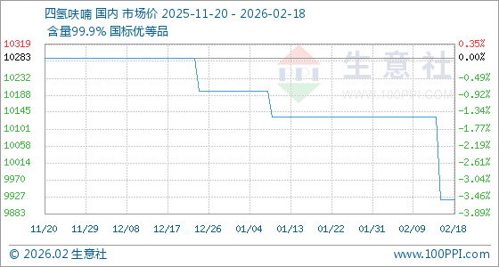 2月18日,生意社四氢呋喃基准价为9920.00元/吨,与本月初(10133.33元/吨)相比,下降了2.11%。