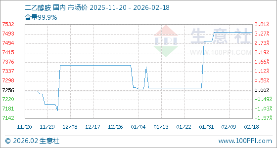 2月18日,生意社二乙醇胺基准价为7500.00元/吨,与本月初(7464.29元/吨)相比,上涨了0.48%。