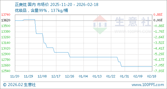 2月18日,生意社正庚烷基准价为12640.00元/吨,与本月初持平。