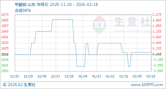 2月18日,生意社甲酸钠基准价为2620.00元/吨,与本月初持平。